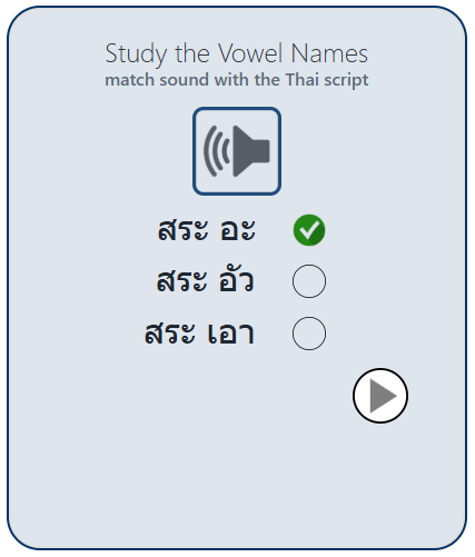 These applications are designed to teach you, not trick you. Consult the Thai vowel chart below as often as you need to, and one day soon, you won't need it anymore.