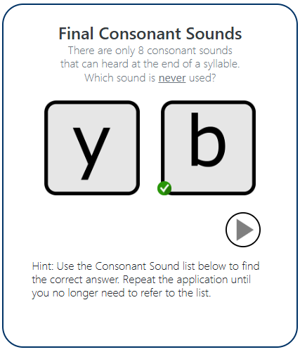 ( Initial ) the sound at the beginning of a syllable. ( Final ) the sound at the end of a syllable. ( - ) silent at the beginning of a syllable. ( -- ) not used at the end of a syllable. |