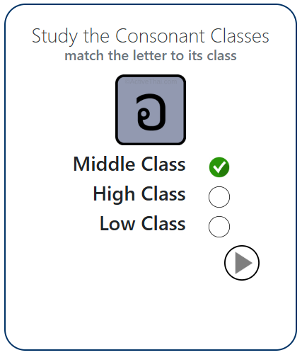 These applications are designed to teach you, not trick you. Consult the Thai consonant chart below as often as you need to, and one day soon, you won't need it anymore.