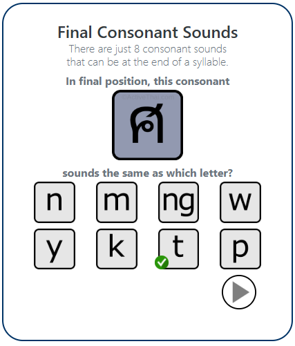 ( Initial ) the sound at the beginning of a syllable. ( Final ) the sound at the end of a syllable. ( - ) silent at the beginning of a syllable. ( -- ) not used at the end of a syllable. |