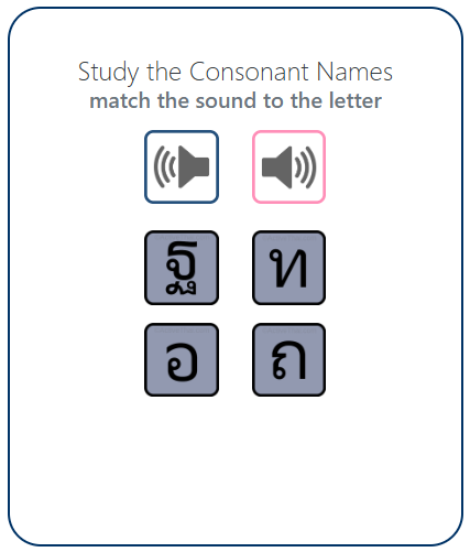 These applications are designed to teach you, not trick you. Consult the Thai consonant chart below as often as you need to, and one day soon, you won't need it anymore.